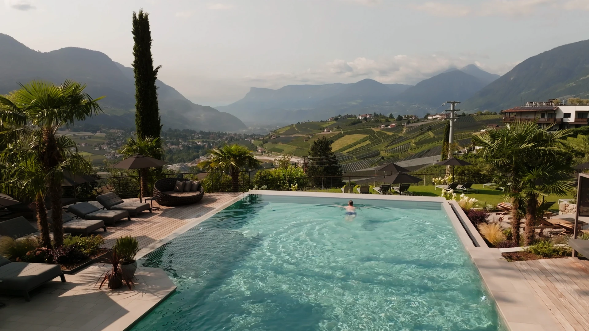 Vor sich sehen Sie Palmen, mediterrane Bäume und eine majestätische Bergkette, die sich im Blau des Infinity-Pools spiegelt. Mit seinen 25 Metern Länge scheint er unendlich zu sein. Eingebettet in unsere Gartenoase wird er ganzjährig beheizt auf 35 °C und bietet zudem entspannende Whirldüsen, Relaxliegen direkt am Pool und eine Wiese mit weiteren Liegeplätzen, die ausreichend Privatsphäre gewährleisten.